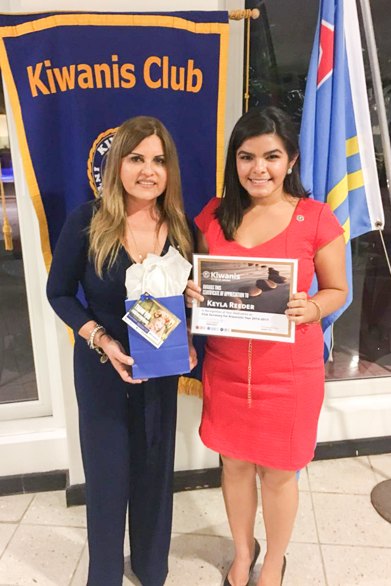 Diaranson ultimo durante e reunion general di Kiwanis Club of Aruba, Lieutenant Governor di Division 26, Giantonio Muller, a haci entrega oficial di e certificadonan di “Distinguished Club” na Aurora Dijkhoff. Alabes a pin Keyla Reeder como “Distinguished Secretary” y Aurora Dijkhoff como “Distinguished President”.