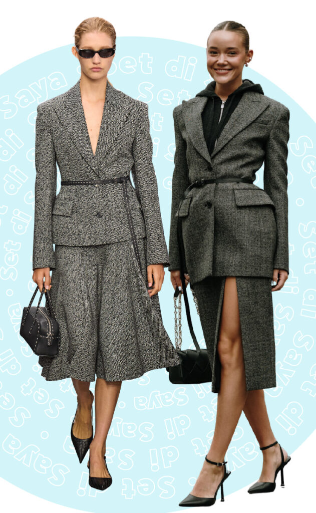 E Set di Saya y Tendencianan di Moda Actual. E set di saya ta leu di ta “moda bieu” y ta haciendo un regreso fuerte den e mundo di moda, pero cu un cambio moderno. Diferencia den largura di saya: Mientras cu e saya potlood te na rudia ta keda un clasico, nos ta mirando tambe hopi saya-midi (largura te memey di batata di pia) y hasta mini-saya combina cu un blazer pa un look mas hubenil y casual. Y no lubida e tas cu ta completa e look. E set di saya no ta djis pa trabou; pero awendia nan ta perfecto tambe pa un salida anochi.
