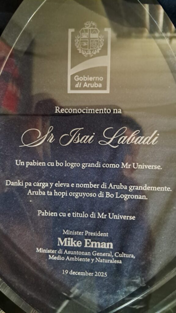 Prome cu Isaï a biaha el a ricibi un reconocemento di Prome Minister di Aruba, Señor Mike Eman, cual e ta bisa ta hopi aprecia.